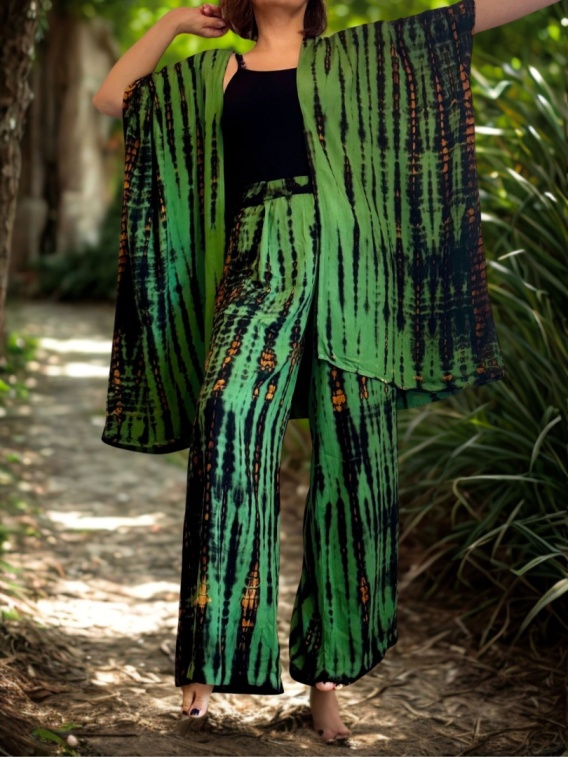 🌿 Green Essence: zielony tie‑dye komplet z kimonem i szerokimi spodniami z rayonu. Lekki, naturalny, idealny na lato, jogę i codzienne rytuały.